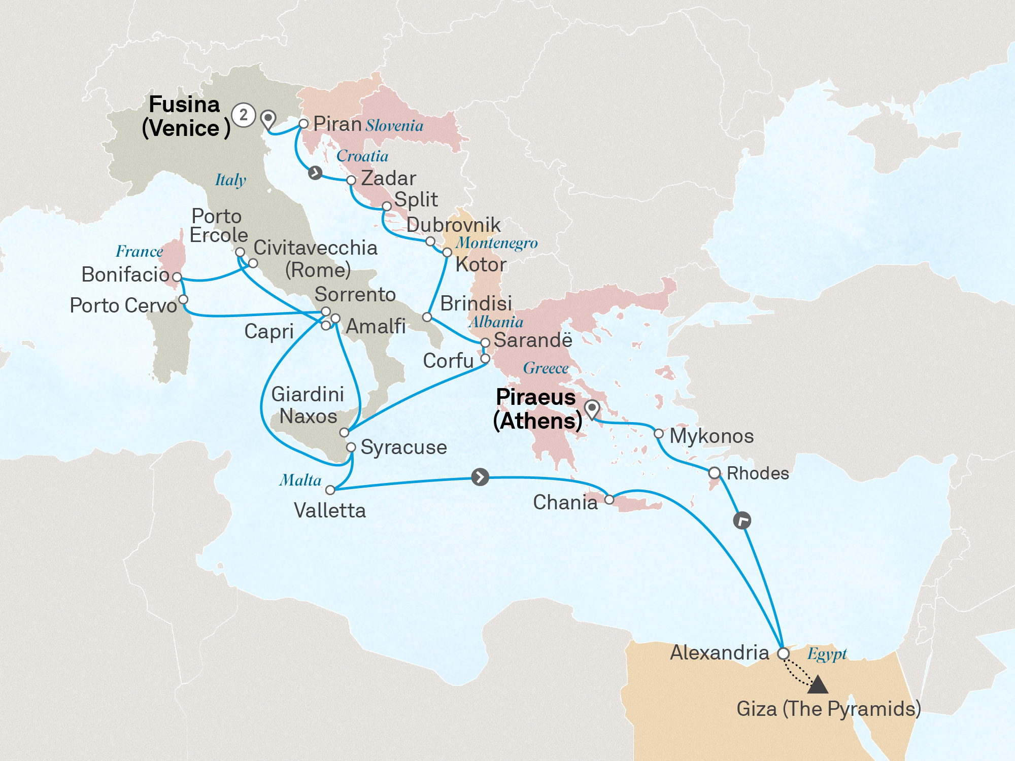 Discover rich heritage and modern luxury at every port. From Venice’s canals to the sunlit Mediterranean shores, each day offers unforgettable sights and authentic experiences. Discover the charm of Taormina, stay overnight in Capri’s enchanting bay, explore historic Rome and marvel at the ancient wonders of Alexandria.